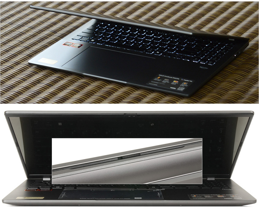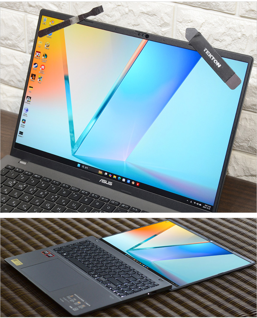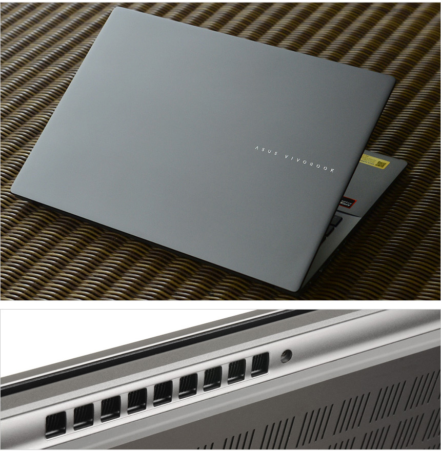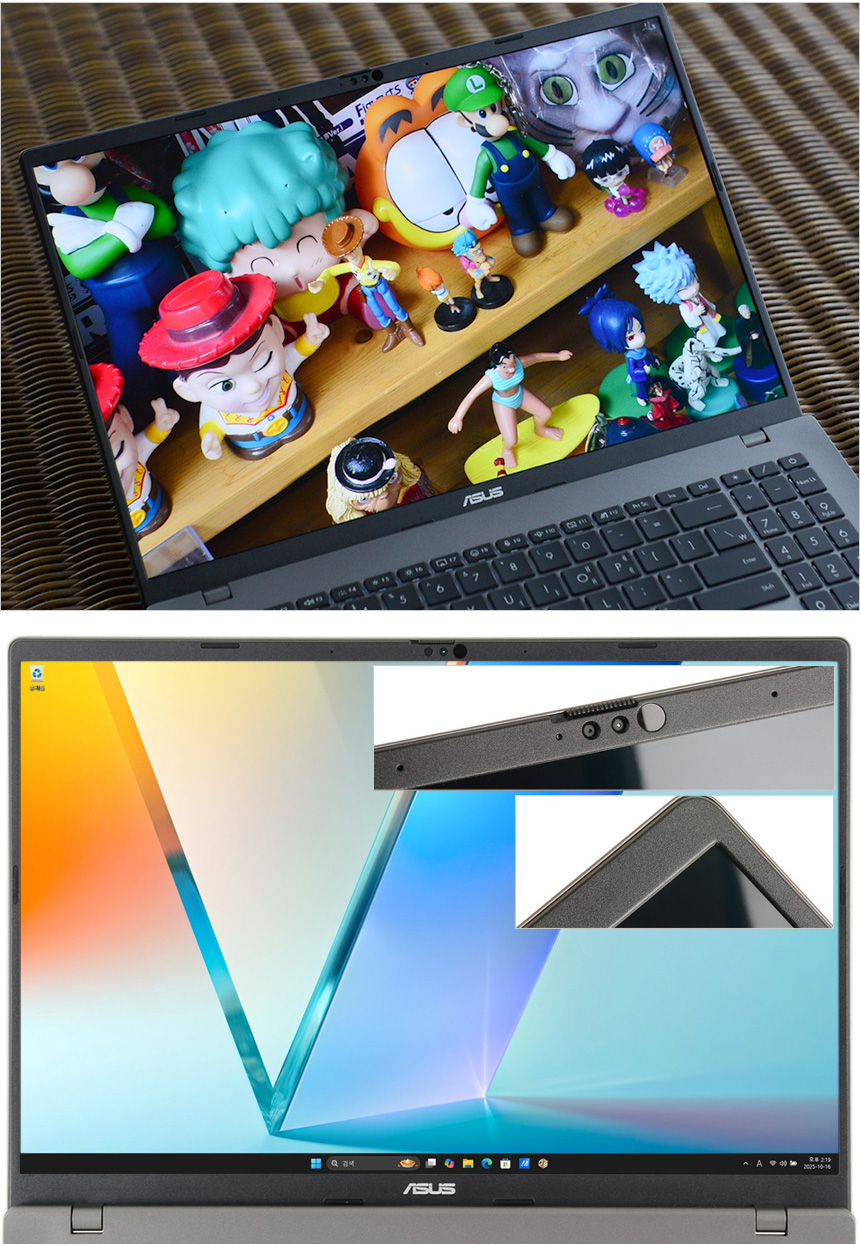 로우 블루라이트 인증과 (TUV 인증 획득) 다양한 디스플레이 설정을 지원해 장시간 노트북 사용시 눈의 피로감이나 시력저하 가능성을 최소화 할 수 있으며 3면 슬림 베젤을 적용해 크기는 줄이고 영상 몰입감은 한층 높였다. (스크린대 바디 비율이 89%에 달한다.) 또한 상단에는 FHD 웹캠과 마이크가 설치되어 화상회의나 셀프촬영 용도로 활용할 수 있다. (AI 소음제거 기술을 지원해 화상회의 등에서 명확하게 음성을 전달할 수 있다.)