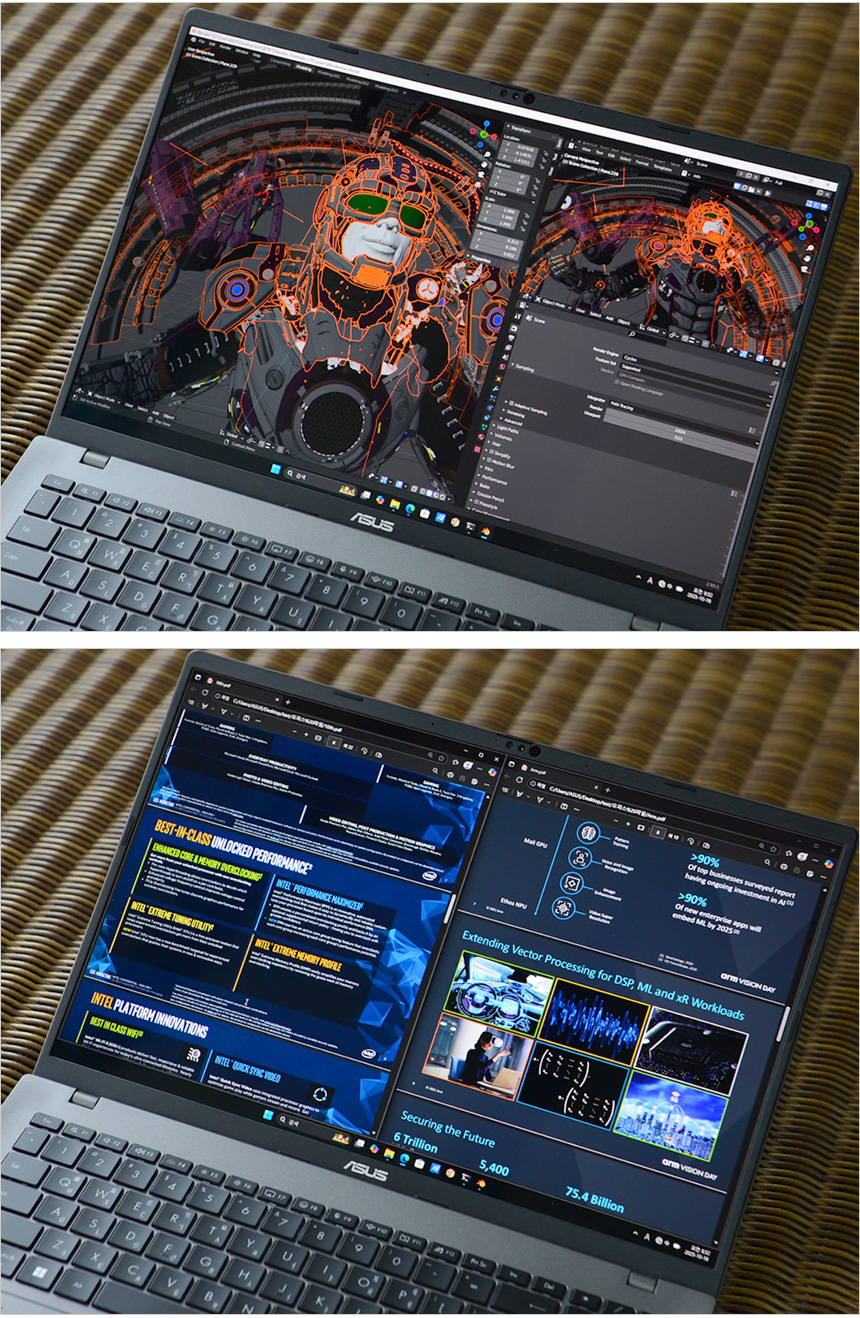 뛰어난 성능으로 활용성을 높인점도 칭찬하고 싶다. 문서작업은 물론 높은 성능을 필요로 하는 학습이나 업무용 S/W를 부드럽게 실행할 수 있으며 AI에 특화된 프로세서 탑재 모델답게 코파일럿을 비롯해 다양한 AI 애플리케이션을 활용할 수 있다. 뿐만 아니라 CPU 사용율이 높은 작업용 프로그램을 사용하는 용도로도 손색이 없다. (내장그래픽의 성능은 높지 않아 게임이나 영상편집 등의 용도로는 추천하지 않는다.)