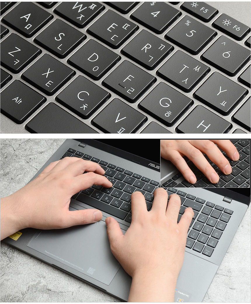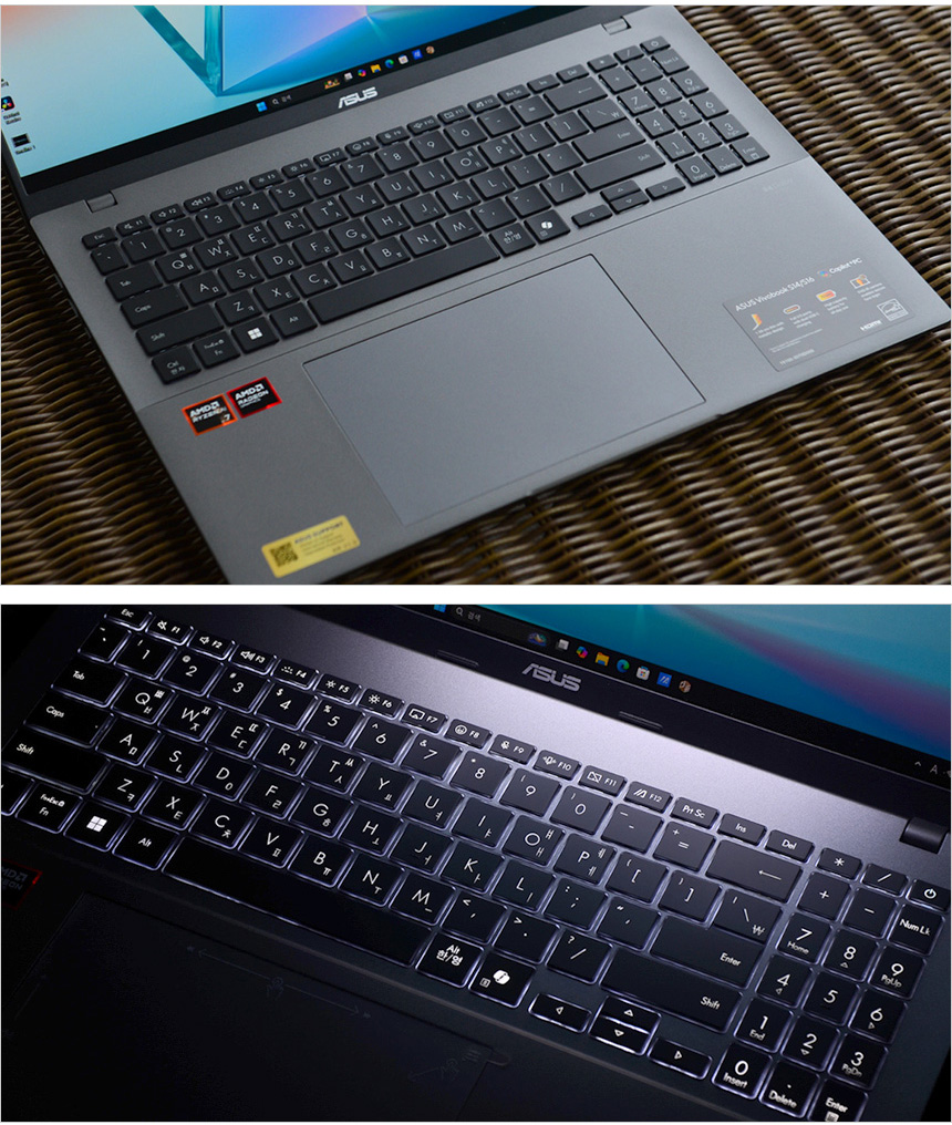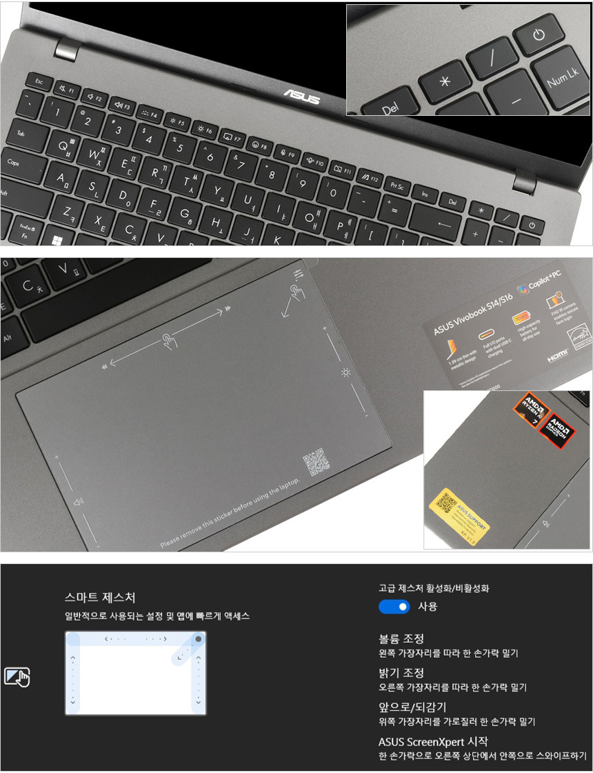 텐키에 전원 버튼이 장착되어 있으며 키보드 1열에는 My ASUS를 비롯한 카메라 및 마이크 비활성화, 볼륨, 밝기조정등 다양한 펑션키를 제공해 편의성을 높였다. 팜래스트 중앙에는 멀티 터치패드가 부착되어 외부에서 노트북을 손쉽게 조작할 수 있다. 이 제품에 장착된 멀티패드는 시원시원한 사이즈와 적당한 마찰력으로 사용성을 높였으며 스마트제스처가 가능해 스크롤을 통해 볼륨과 밝기 조정,비디오 재생제어가 가능하다. 외부에서 편하게 노트북을 사용할 수 있을 것이다.