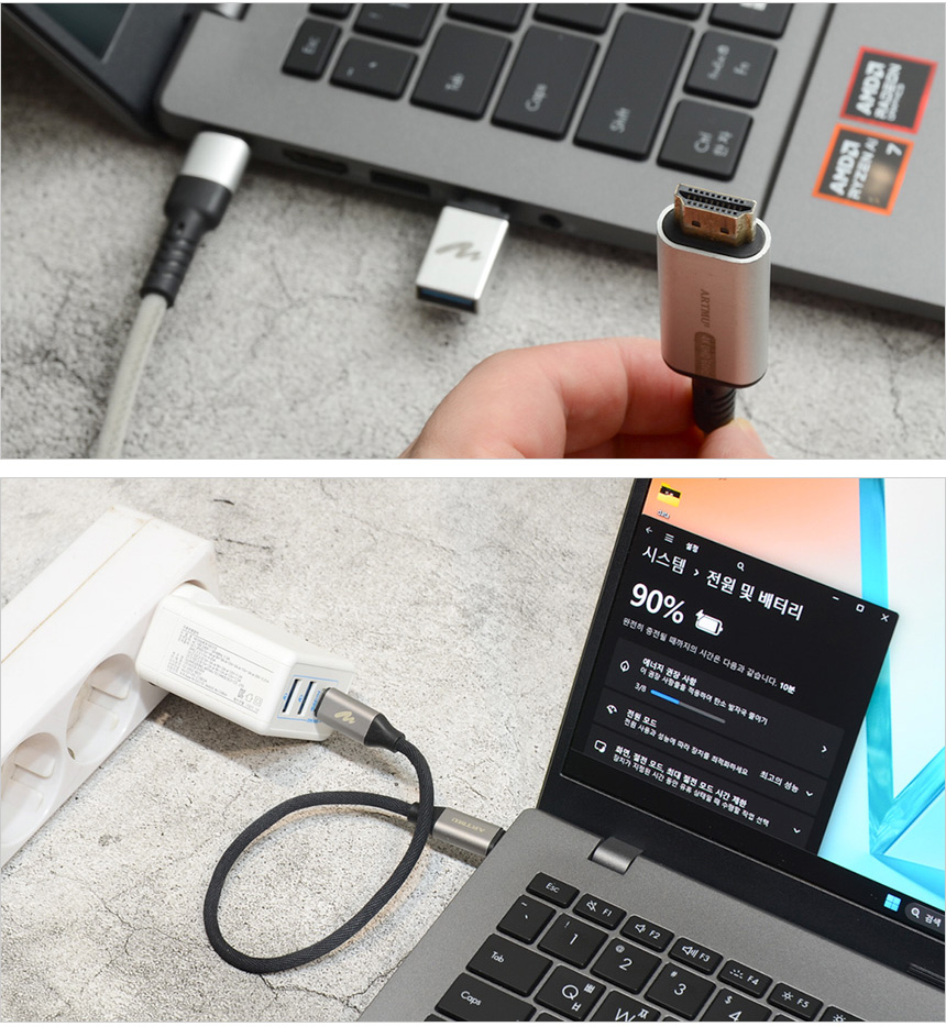 2개의 C타입 단자는 고속 데이터 전송이 가능한 것은 물론 디스플레이 출력을 지원해 모니터나 프로젝터 등을 연결할 수 있다. 또한 젠더를 사용하면 A타입의 일반 주변기기도 편하게 연결할 수 있으며 PD 충전 지원으로 시중에서 쉽게 구입할 수 있는 PD충전기를 사용에 노트북의 전원을 공급할 수 있다.