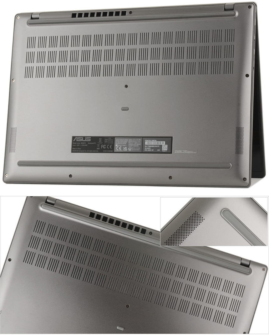 노트북 바닥면의 모습으로 상단과 하단에 고무패드가 설치되어 충격 등으로부터 제품을 보호할 뿐만 아니라 미끄러짐을 방지한다. 또한 하단 양 측면에는 돌비 애트모스 지원 스피커가 설치되어 퀄리티 높은 사운드를 즐길 수 있다.