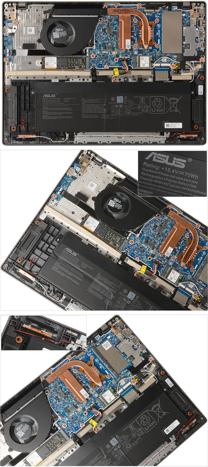노트북 내부의 모습으로 프로세서의 열을 식히기 위해 팬과 히트파이프가 설치되어 있고 하단에는 4548mAh 용량의 리튬이온 배터리를 비롯해 스피커와 무선랜 안테나, 마그네특 등이 설치된 것도 눈에 띈다.