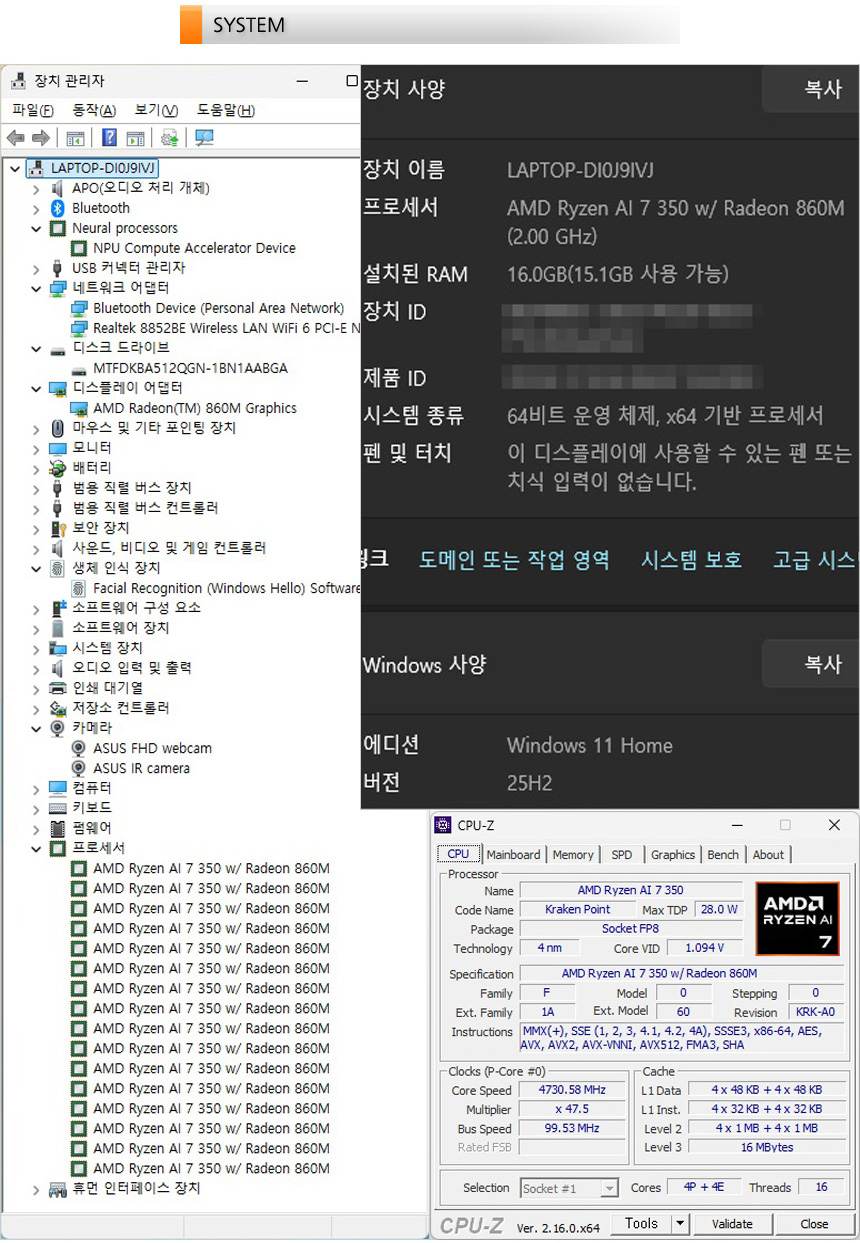 시스템 정보를 확인하고 있는 모습으로 8코어 16스레드에 16MB 캐시가 적용된 AMD 라이젠 AI 7 350 프로세서가 장착된 것을 확인할 수 있으며 AI 노트북 답게 NPU도 탑재된 것을 확인할 수 있다. 16GB 메모리와 512GB 의 넉넉한 저장공간을 지원해 성능이나 용량걱정 없이 편하게 노트북을 사용할 수 있으며 얼굴인식 로그인 지원으로 보안성을 높일 수 있고 Wi-Fi 6 무선랜카드가 장착되어 블루투스를 이용한 주변기기 연결은 물론 빠른 무선속도를 즐길 수 있다.