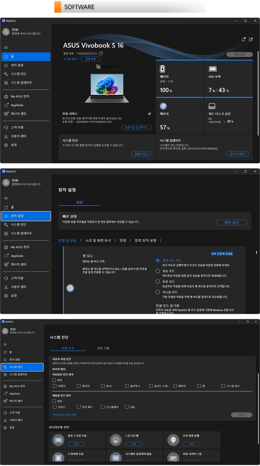 MyASUS 앱을 실행한 모습으로 (핫키를 지원해 빠르게 실행할 수 있다.) 업데이트를 지원해 최상의 컨디션을 유지할 수 있으며 원클릭 진단 기능을 지원해 시스템의 문제를 빠르게 파악할 수 있다. @ 팬모드나 디스플레이, 배터리등 세부 설정은 동영상을 통해 확인하기 바란다.