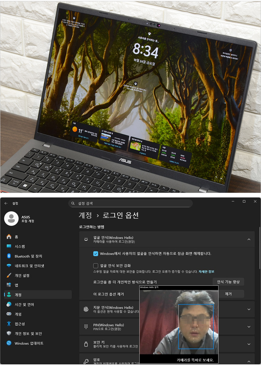 얼굴인식 로그인을 사용할 수 있다. 설정-계정에 있는 로그온 옵션에서 윈도우즈 헬로를 실행해 얼굴을 등록할 수 있으며 인식율도 뛰어나 어떤 환경에서도 편하게 사용할 수 있다. (비즈니스 노트북으로도 적합한 모델이다.)