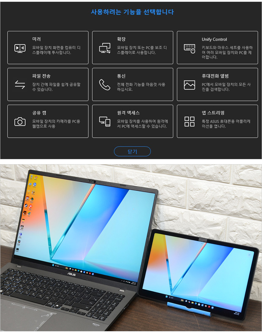 GlideX 앱을 지원해 화면의 복제나 확장, 유니파이 컨트롤이 가능하다. 상단의 사진은 확장 기능을 실행한 모습으로 태블릿 PC를 확장 모니터로 사용할 수 있었다. (참고로 미러를 선택하면 스마트폰 화면이 노트북에 표시된다.) 참고로 Microsoft Phone Link를 설치해 스마트폰과 연결해 주면 전화를 걸거나 받고, 문자에 답장할 수 있으며 알림등을 실시간 으로 확인할 수 있다.