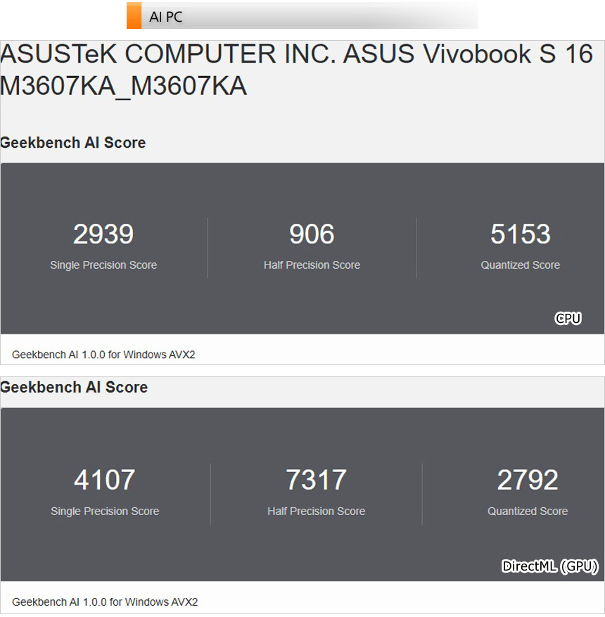 AI 전용 벤치마크 툴을 이용해 AI 성능 테스트를 진행하고 있는 모습으로 NPU가 탑재된 고성능 프로세서가 탑재된 모델답게 보급형 노트북과 비교되는 높은 스코어를 보여주었다.