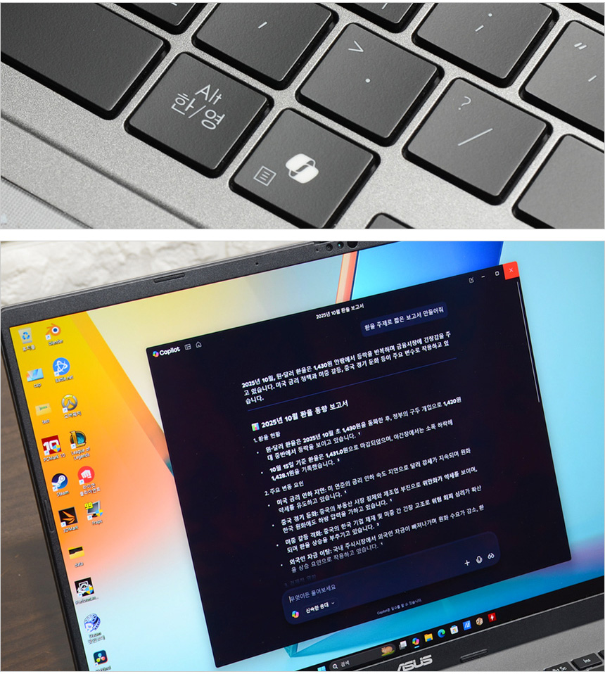 코파일럿을 편하게 사용할 수 있도록 전용키를 제공한다. 상단의 사진은 코파일럿을 실행한 모습으로 환율관련 보고서를 요청했는데 빠르게 만들어 주는 것을 확인할 수 있었다. AI를 쉽게 체감하고 싶다면 코파일럿부터 사용해 보기 바란다.