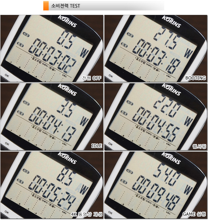 소비전력 테스트를 진행하고 있는 모습으로 (최고 성능 모드) 아이들 이나 캐주얼한 작업시 10~30W 대의 소비전력으로 작동했으며 게임 실행이나 랜더링 에서는 60W 까지 소비전력이 올라가는 것을 확인할 수 있었다.