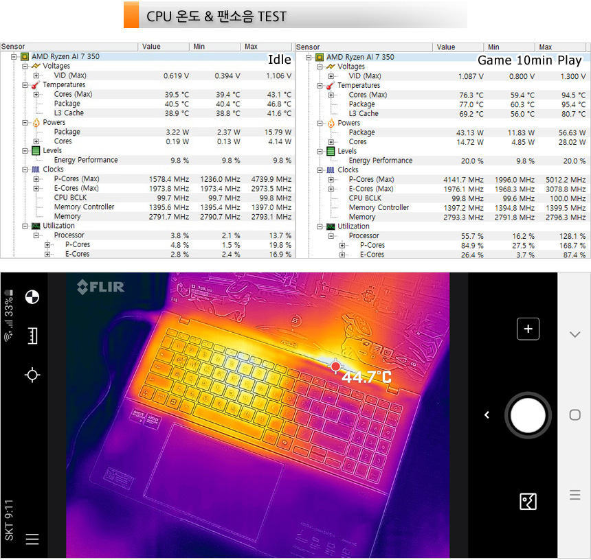 또한 열화상 카메라를 이용해 게임 실행중 열분포를 확인해 보았는데 프로세서가 설치된 중앙부를 중심으로 열이 퍼져나가며 팜래스트의 온도는 상당히 낮아 열로 인한 스트레스 없이 손을 올려두고 사용할 수 있다.