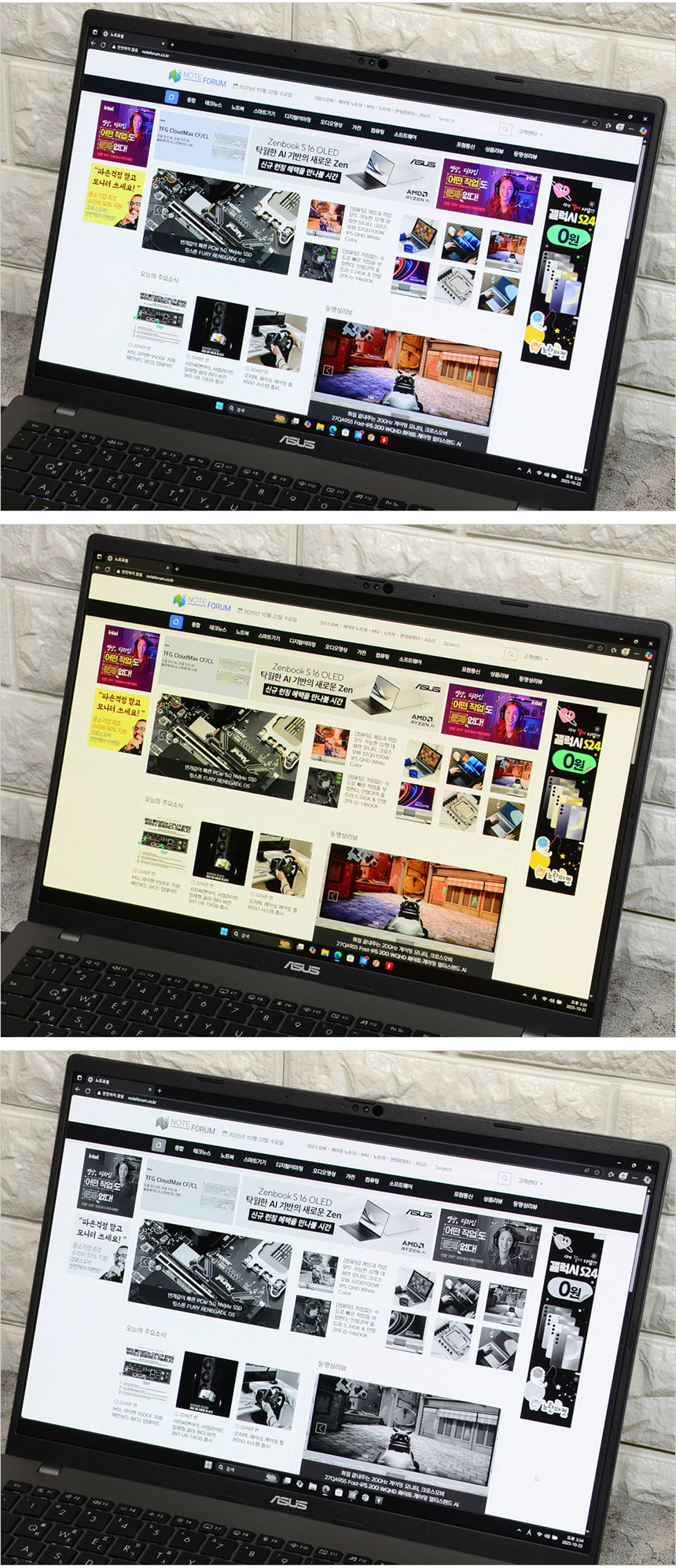 장시간 작업이나 학습용으로 노트북을 사용하는 유저들의 눈건강을 고려해 다양한 화면모드를 제공한다. 상단의 사진은 블루라이트를 줄여주는 아이케어 모드와 글을 읽기 편하도록 흑백으로 영상을 제공하는 E-BOOK 모드를 실행한 모습으로 노멀 모드와 확연히 다른 영상을 보여주었다.