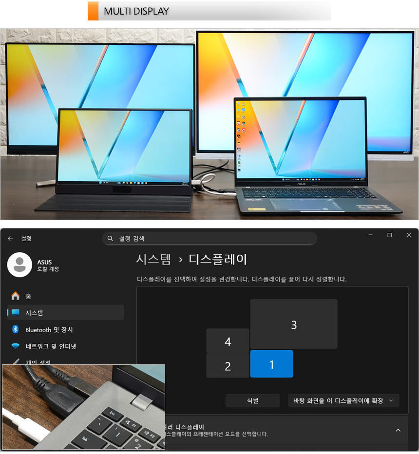 2개의 C타입 단자가 디스플레이 출력을 지원해 HDMI를 포함한 3개의 모니터를 추가할 수 있다. 상단의 사진은 멀티 디스플레이 테스트를 진행하고 있는 모습으로 원할하게 작동하는 것을 확인할 수 있었다. 다중 모니터 사용이 필수적인 직장인 이나 대학생들이 특히 유용하게 활용할 수 있을 것이다.