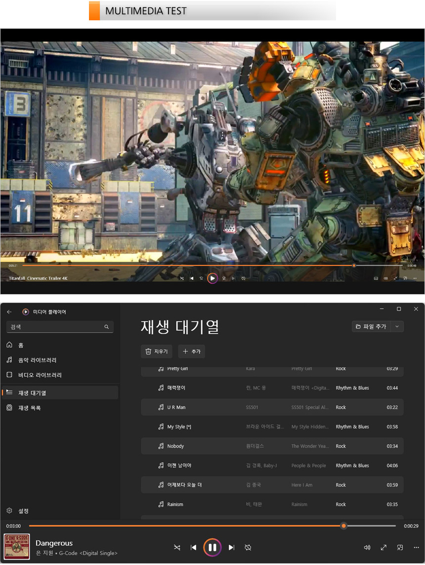 4K 동영상을 이용해 멀티미디어 테스트를 진행하고 있는 모습으로 16형 대화면 디스플레이에 슬림베젤 적용으로 시원시원한 영상을 즐길 수 있으며 OLED 특유의 선명함이 더해져 높은 몰입감을 경험할 수 있었다. (16:9 비율 노트북과 달리 레터박스가 생기기는 하지만 크게 거슬리지 않았다.) 사운드도 상당히 준수한 모델로 동영상 감상용으로 유용하게 활용할 수 있을 것이다.