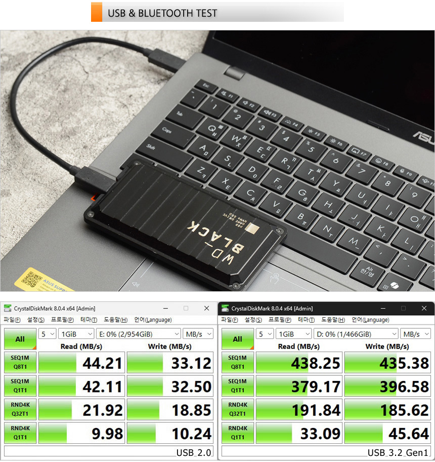 USB 3.2 Gen1 단자를 지원해 빠른 데이터 전송이 가능하다. 상단의 사진은 외장 SSD를 이용해 테스트를 진행하고 있는 모습으로 USB 3.2 Gen1과 확연한 차이를 보여주었다. 대용량 데이터 전송이 잦은 유저들이라면 만족하며 사용할 수 있을 것이다.