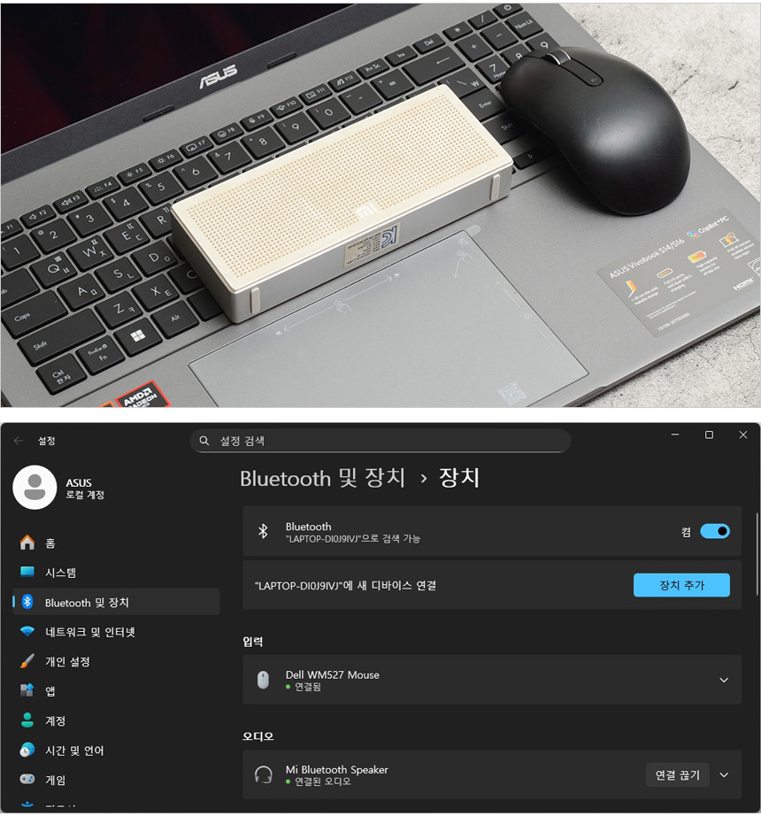블루투스를 지원해 다양한 주변기기를 무선으로 연결해 활용할 수 있다. 상단의 사진은 외장 스피커나 마우스 페어링 테스트를 진행하고 있는 모습으로 원활하게 연결되는 것을 확인할 수 있었다.