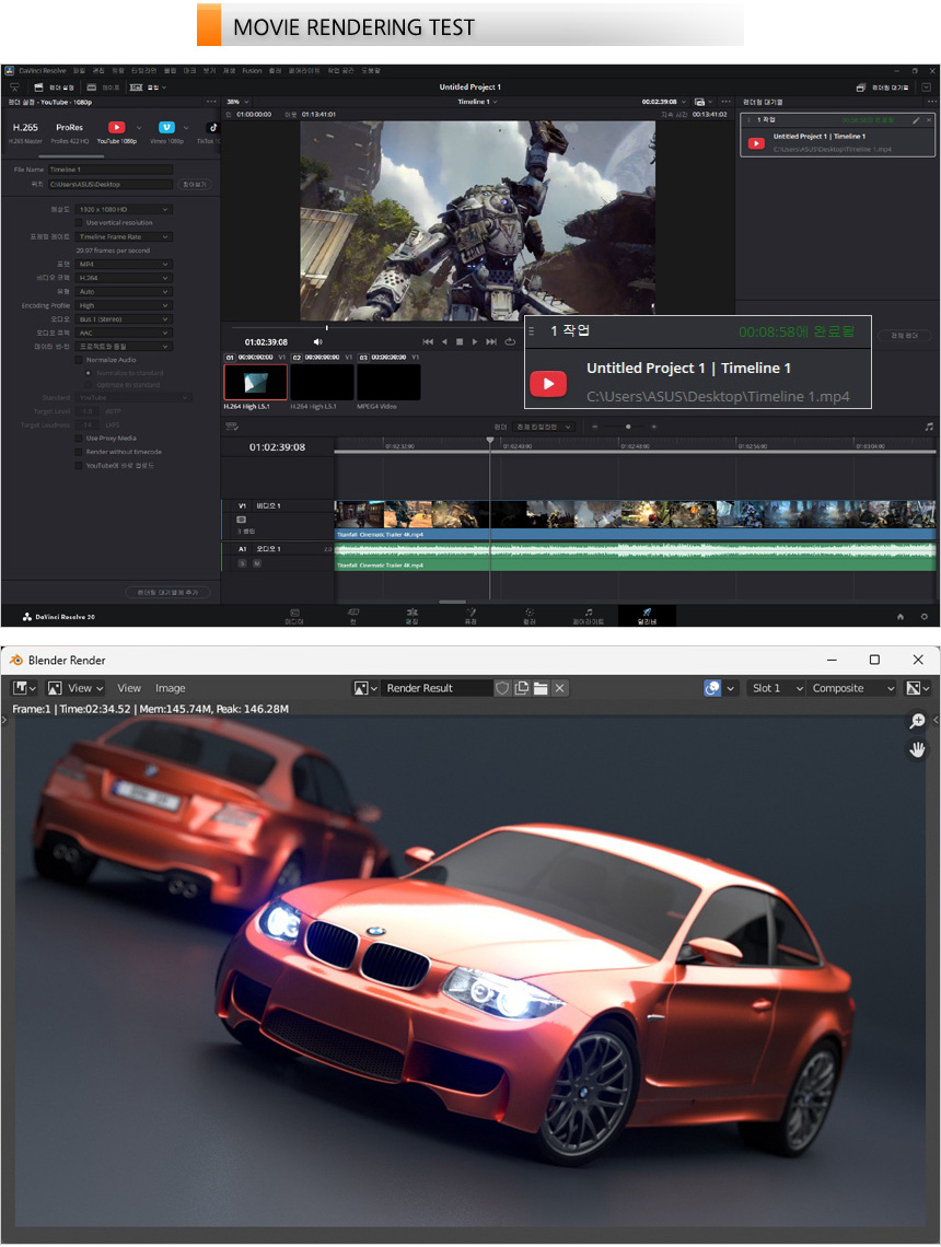 영상편집 S/W 다빈치 리졸브를 이용해 랜더링 테스트를 진행하고 있는 모습으로 (640MB, 920MB, 990MB 4K 동영상을 단일 동영상으로 랜더링, FHD 해상도에 H.264 비디오 코덱) 8분 58초가 소요되는 것을 확인할 수 있었다. 또한 블랜더 랜더링 테스트에서도 2분대의 빠른 랜더링 시간을 보여주었다. (CPU 사용율이 높은 블랜더 랜더링에서 특히 빠른 속도를 보여주었다.)
