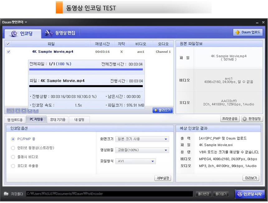 동영상 인코딩 테스트를 진행하고 있는 모습으로 3분 초반대의 빠른 인코딩 속도를 보여주었다. (고성능 프로세서를 탑재한 모델답게 인코딩 시간이 대단히 빠르다.)