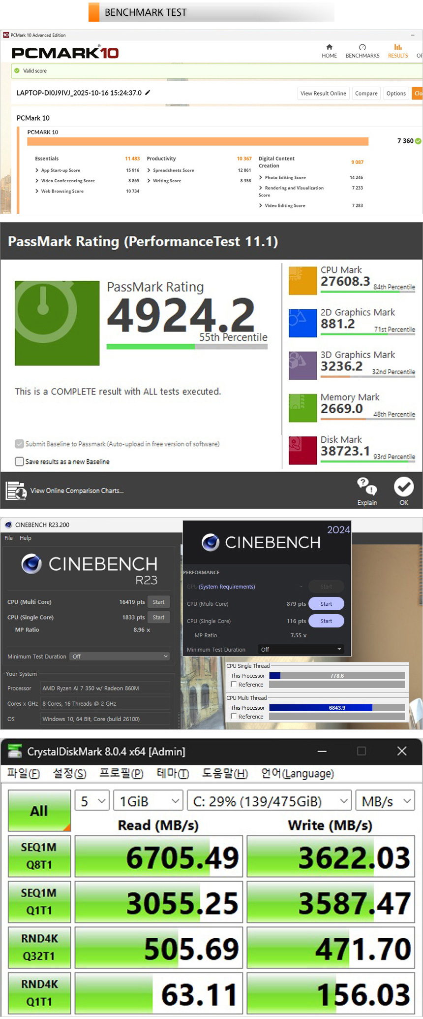 벤치마크 테스트를 진행하고 있는 모습으로 디자인 등의 작업도 부드럽게 실행할 수 있는 높은 스코어를 보여주었다. 또한 저장장치의 속도를 확인해 보았는데 PCIe 4.0 NVMe SSD를 사용해 빠른 속도를 보여주었다. 512GB 의 넉넉한 용량 지원으로 여유롭게 S/W를 설치하거나 데이터를 저장할 수 있다.