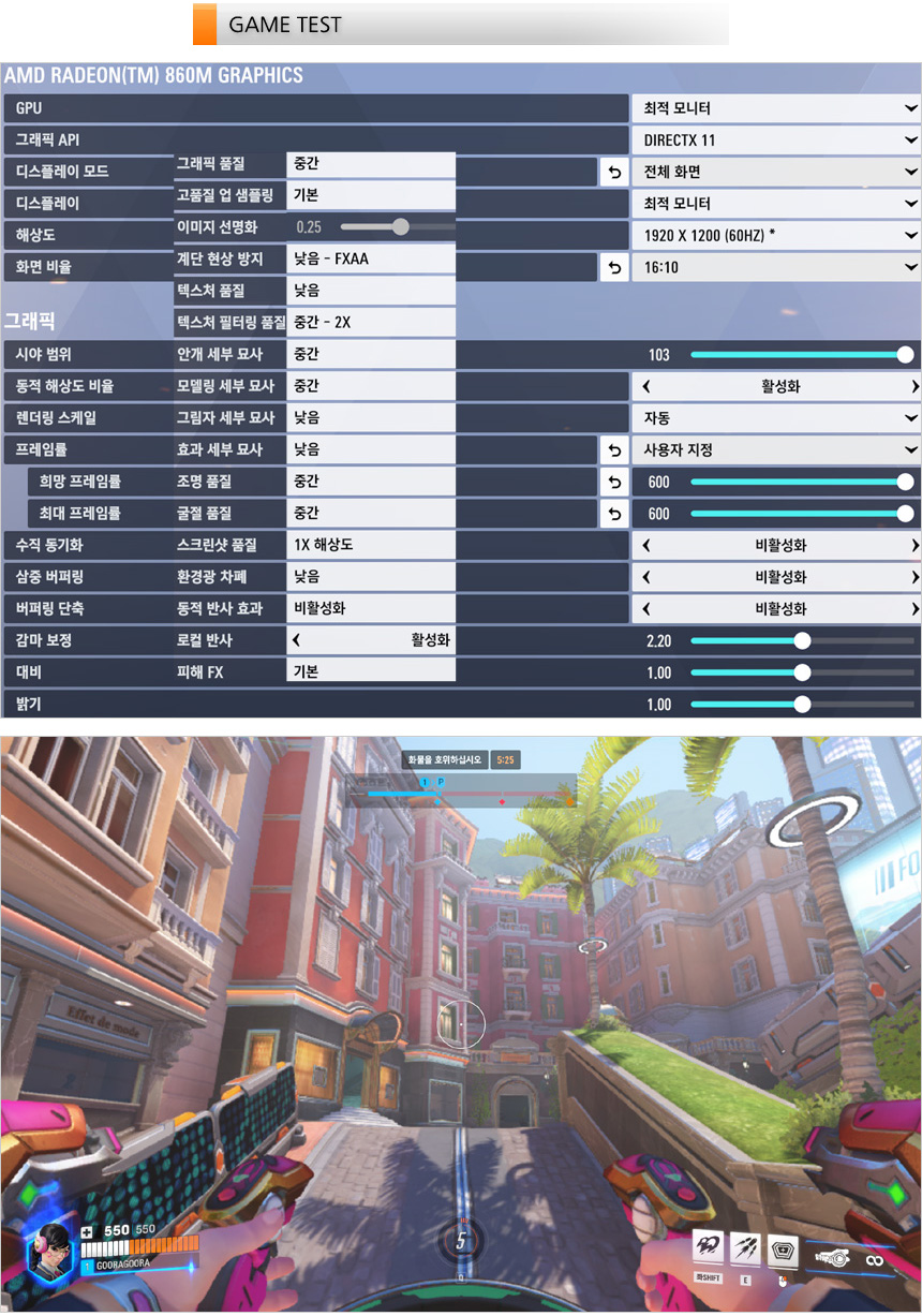 오버워치2를 플레이라 하고 있는 모습으로 중간 옵션에서 101-133 프레임으로 플레이 되는 것을 확인할 수 있었다. 여유롭게 게임을 즐길 수 있을 것이다.