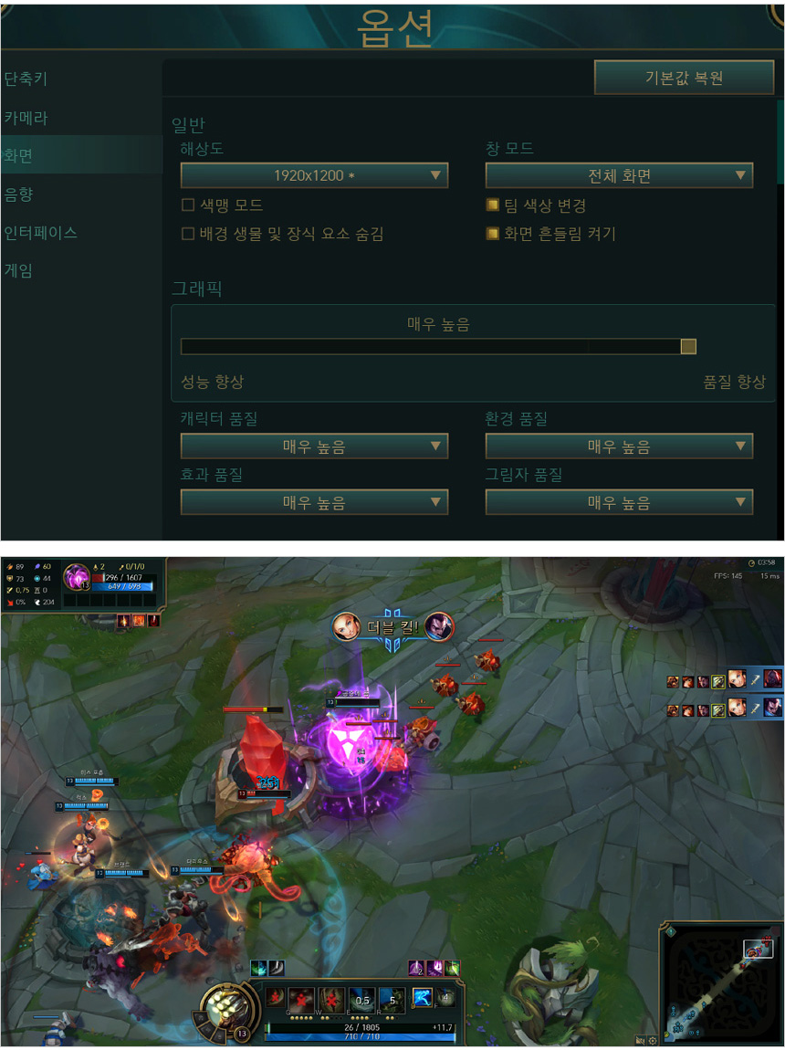 LOL을 매우 높음 옵션에서 플레이 하고 있는 모습으로 (연습모드) 135-201 프레임을 보여주어 부드럽게 게임을 즐길 수 있었다. 멀티게임도 깔끔하게 즐길 수 있을 것이다.