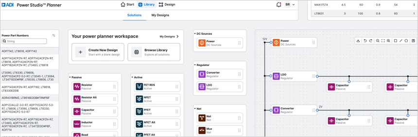 ADI Power Studio Planner는 시스템 수준의 파워 트리 구상을 위한 차세대 웹 기반 툴로, 엔지니어에게 시스템 아키텍처에 대한 인터랙티브한 뷰를 제공함으로써 전원 분배 모델링, 전력 손실 계산, 시스템 효율 분석을 손쉽게 수행할 수 있도록 한다. 또한 지능형 파라미터 검색 및 트레이드오프 비교 기능을 제공해, 엔지니어링 팀이 시작 단계부터 더 빠르고 더 나은 아키텍처 결정을 내릴 수 있게 한다.