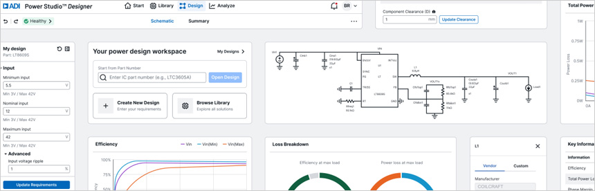 ADI Power Studio Designer는 IC 수준의 전원 설계를 위한 강력한 웹 기반 툴로, 최적의 부품 추천, 성능 예측, 맞춤형 효율 분석을 제공한다. ADI의 검증된 전원 설계 아키텍처를 기반으로 구축된 Power Studio Designer는 가이드형 워크플로우를 통해 엔지니어가 핵심 파라미터를 설정하고, 이후 작업 과정을 시뮬레이션, 설정 및 평가 단계로 자신 있게 진행해 나갈 수 있도록 한다. 이러한 단계별로 사용자를 안내하기 때문에, 엔지니어는 LTspice와 SIMPLIS 회로도를 활용해 정확한 모델을 구축하고 실세계 환경에 대한 시뮬레이션을 거친 다음 하드웨어 작업으로 넘어갈 수 있다.