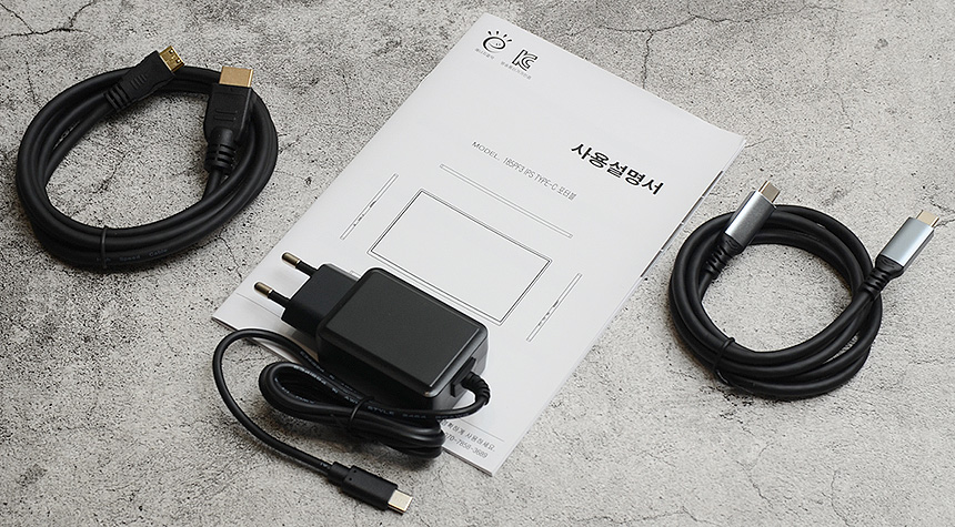 기본 제공되는 액세서리의 모습으로 C타입과 HDMI 케이블을 비롯해 15W 전원 어댑터와 설명서를 지원한다.