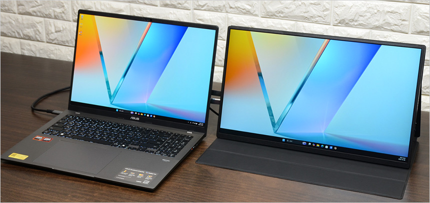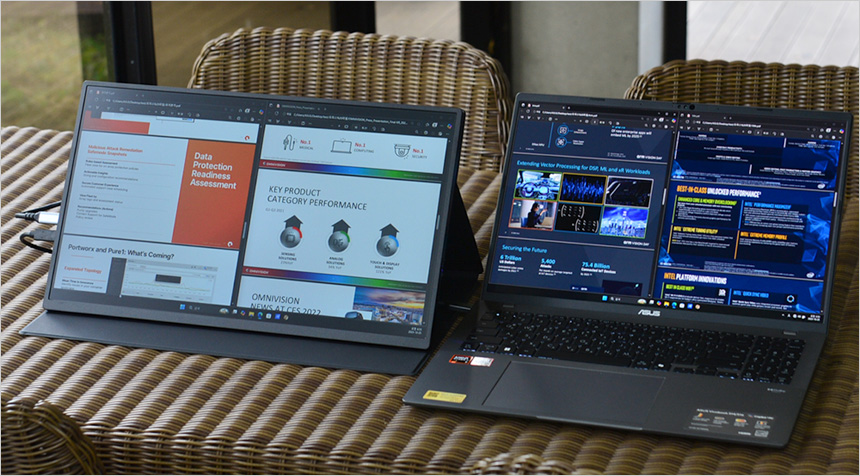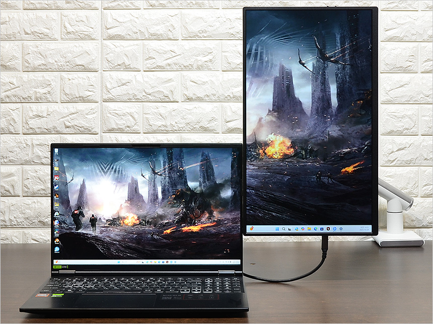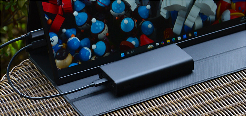 최근 출시되는 노트북중 상당수가 HDMI 뿐만 아니라 C타입 디스플레이 출력을 지원해 편하게 노트북과 연결해 사용할 수 있다. 데스크탑PC와 달리 모니터 추가가 쉽지 않은 노트북에서 듀얼모니터 활용으로 생산성을 한층 높일 있다. (썬더볼트 4 와 같은 고전력 지원 단자의 경우 C타입 연결만으로 모니터 사용이 가능하지만 일반 USB 단자는 원활하게 전력을 공급할 수 없다. 전원 어댑터 사용이 힘든 외부에서는 사진과 같이 15W를 지원하는 외장 배터리를 사용하기 바란다.)