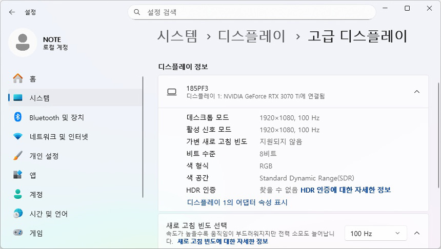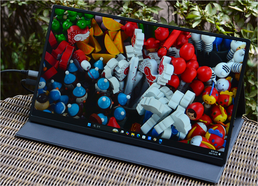 테스트를 위해 책상에 설치한 모습으로 기존의 포터블 모니터와 확연히 비교될 정도로 크기가 상당한 것을 확인할 수 있다. 서브 모니터로만 사용되는 기존 제품들과 달리 메인 모니터로도 충분히 사용할 수 있을 것이다. 또한 HDR 지원모델 답게 설정이 활성화 된 것을 확인할 수 있다.