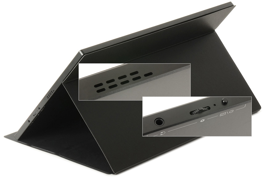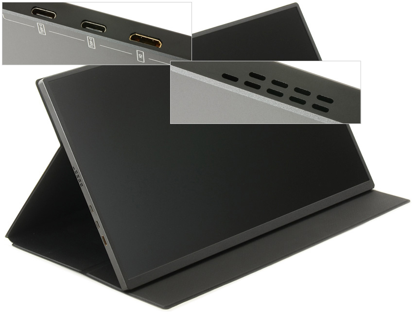 모니터 좌측면의 모습으로 C타입 디스플레이 출력을 지원하는 PC나 노트북, 스마트폰과 손쉽게 연결할 수 있도록 2개의 C타입 단자가 제공되며 (C타입 단자는 디바이스 연결 뿐만 아니라 전원공급용으로 사용된다.) HDMI 만을 지원하는 제품들을 위해 HDMI 단자가 설치되어 있다. 또한 스피커가 장착되어 시원시원한 사운드를 즐길 수 있다.