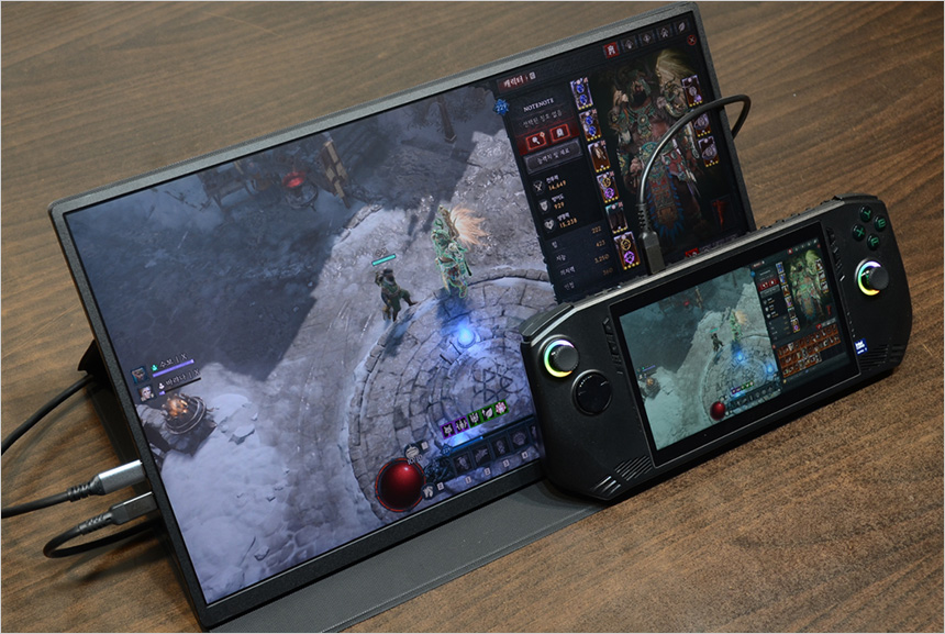 최근 많은 유저들이 PC 게임을 즐기기 위해 구입하고 있는 게이밍 UMPC나 닌텐도 스위치와 같은 TV연결 지원 디바이스와 연결해 대화면으로 게임을 즐길 수 있다. 상단의 사진은 게이밍 UMPC와 C타입으로 연결해 디아블로 4를 플레이 하고 있는 모습으로 7형의 화면크기가 작게 느껴졌는데 18.5형 대화면 모니터에서 게임을 즐기는 몰입감이 훨씬 높았다.