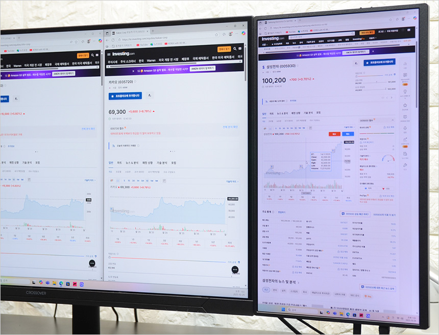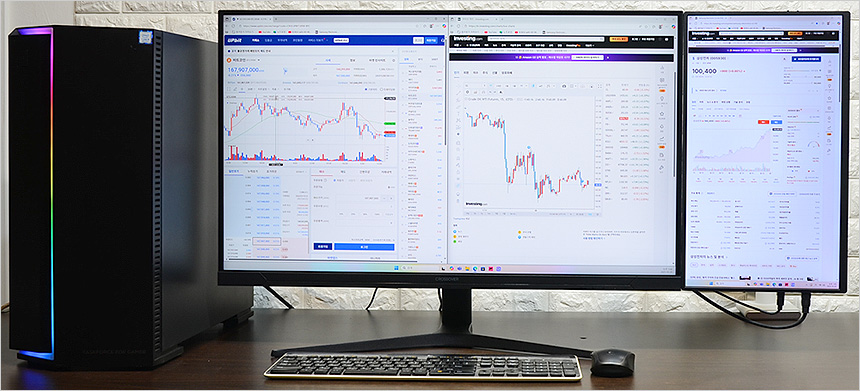 주식이나 코인에 투자하고 있는 유저들에게도 좋은 대안이 될 것이다. 일반 포터블 모니터 대비 화면 크기가 커 한눈에 정보를 확인할 수 있으며 모니터가 서로 떨어질 경우 즉각적인 정보 확인이 힘들수 있는데 사진과 같이 2개의 모니터가 자연스럽게 연결되어 있어 급격하게 변하는 시장 상황을 빠르게 확인하고 대응할 수 있다.