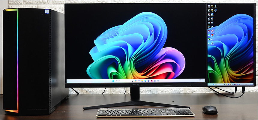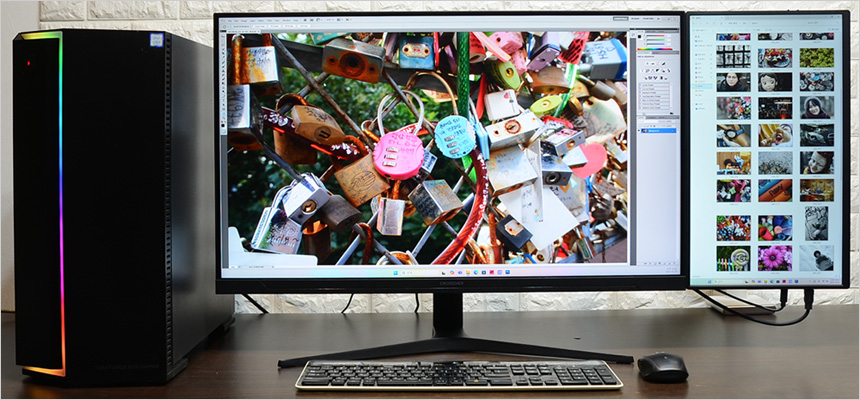 대부분의 포터블 모니터는 일반 모니터 측면에 놓아두고 보조 모니터로 활용된다. 리뷰를 진행하는 크로스오버 185PF3 IPS TYPE-C 포터블 또한 스탠드 케이스가 제공되어 편하게 책상에 올려두고 사용할 수 있다. 특히 32형 모니터를 사용하고 있을 경우 사진과 같이 ARM을 이용해 세로모드를 적용하면 크기가 딱 맞아 모니터를 연장한 것과 같은 효과를 경험할 수 있다.