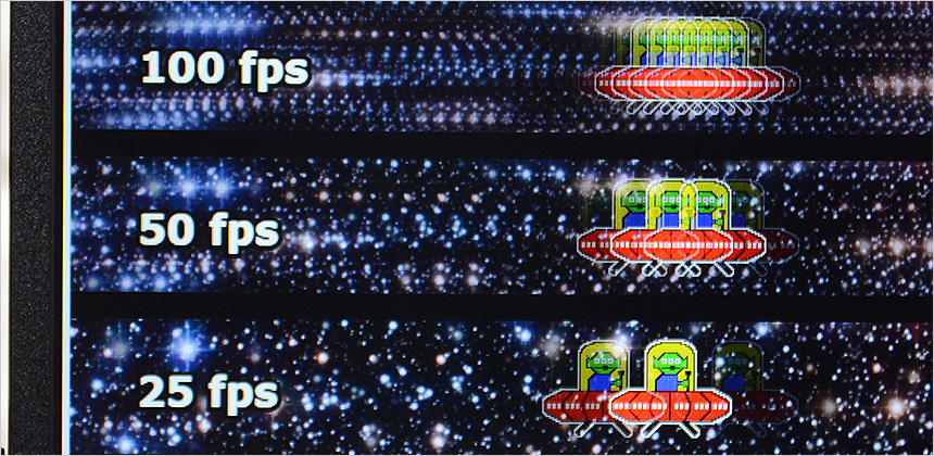 100Hz 주사율을 지원해 부드러운 영상을 움직임을 즐길 수 있다. 상단의 사진은 100Hz 주사율을 쉽게 확인할 수 있도록 하위 프레임과 같이 재생되는 영상 (960 Pixel Per Sec) 을 셔터스피드 1/20 로 촬영한 모습으로 프레임이 높아질수록 시간당 많은 화면이 뿌려지기 때문에 캐릭터의 수가 많은 것을 확인할 수 있다. @ 대부분의 포터블 모니터는 60Hz 주사율을 지원한다. 100Hz 지원은 큰 매리트라 할 수 있다.
