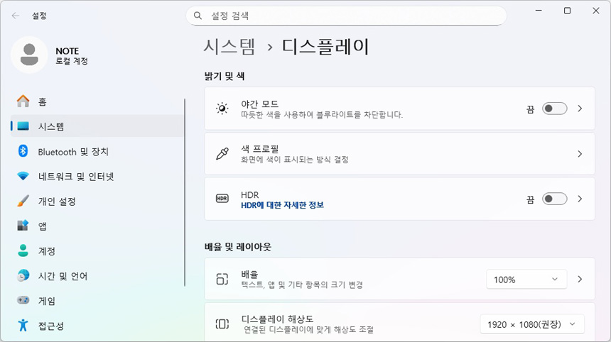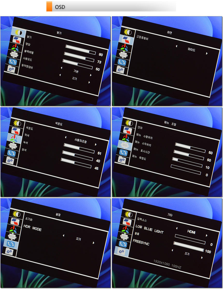OSD의 모습으로 다양한 기능이 제공되는 것을 확인할 수 있다. (볼륨과 밝기는 핫키로 제공되어 빠르게 조작할 수 있다.) 기본적인 밝기와 명암 설정을 비롯해 색온도도 원하는 대로 조정할 수 있으며 블루라이트 설정과 같은 아이케어 기술도 지원해 유용하게 사용할 수 있다. 또한 HDR 설정도 지원한다.