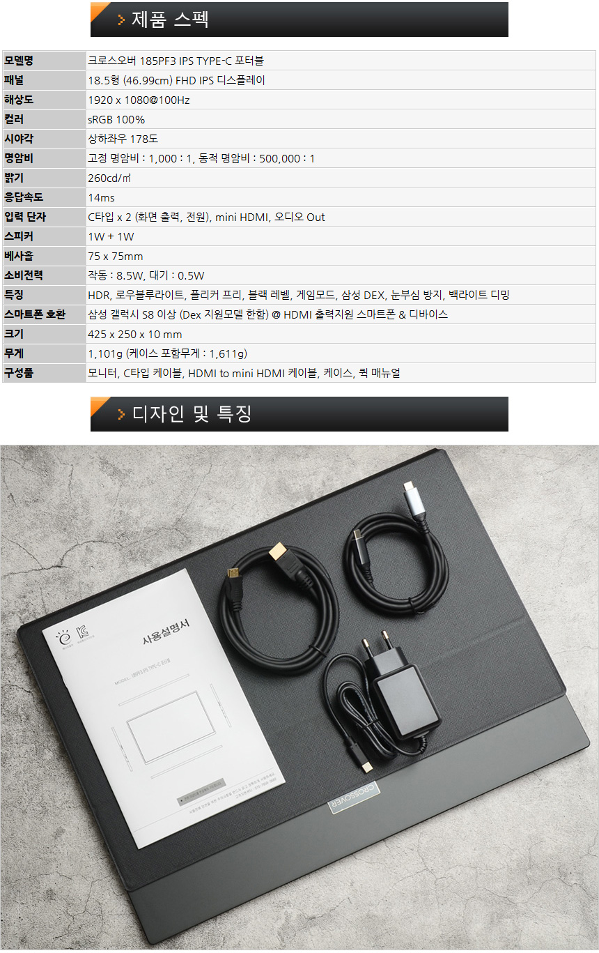 이번에 리뷰를 진행 할 크로스오버 185PF3 IPS TYPE-C 포터블 은 다용도로 활용할 수 있는 포터블 모니터로 18.5형 대화면을 지원해 탁 트인 시원한 영상을 즐길 수 있다. IPS 패널을 탑재해 시야각 없는 선명한 영상을 즐길 수 있으며 슬림 베젤로 크기를 최소화 했을 뿐만 아니라 화면크기 대비 무게도 가벼워 편하게 들고 다니며 사용할 수 있다.