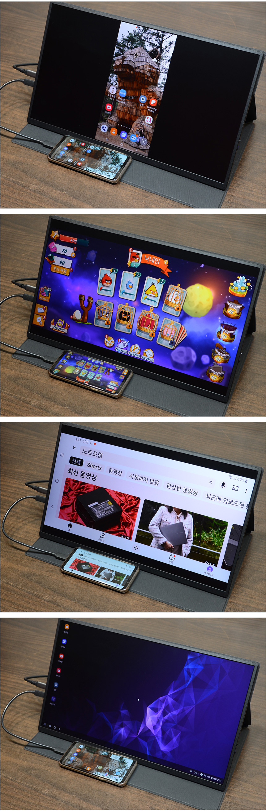 스마트폰 화면을 대화면으로 즐기고 싶은 유저들도 유용하게 활용할 수 있다. 상단의 사진은 삼성 갤럭시 9 과 C타입 케이블로 연결해 미러링 모드를 실행한 모습으로 원할하게 작동하는 것을 확인할 수 있었다. 또한 삼성 DEX 모드를 실행하면 스마트폰을 PC처럼 활용할 수 있다. (키보드와 마우스는 스마트폰과 블루투스로 연결해 주면 된다.)