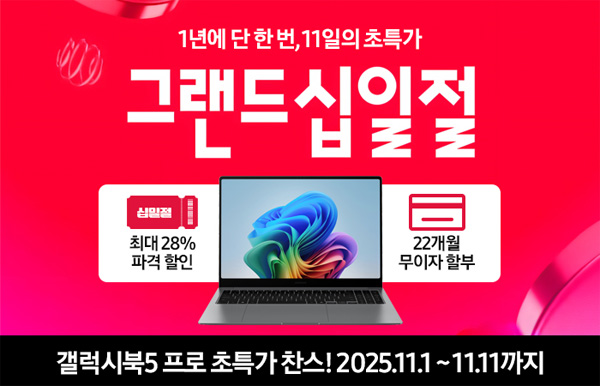 유니씨앤씨는최신 인텔 코어 울트라 애로우레이크 프로세서와 WQXGA+ Dynamic AMOLED 2X 터치스크린을 탑재한 삼성 갤럭시북5 프로 NT965XHW-A51A 대상으로 최대 58만원 할인과 최대 22개월 무이자 할부,갤럭시 제휴 혜택 등의 다양한 혜택이 증정되는 ‘그랜드십일절’ 프로모션을 2025년 11월 1일부터 11월 11일까지 11번가를 통하여 진행한다.