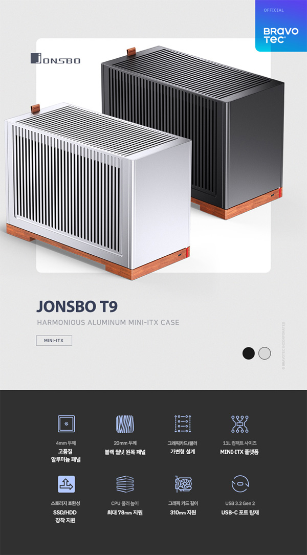 브라보텍에서 가변형 설계와 세련된 마감으로 다양한 하드웨어를 수용하고, JONSBO만의 독창적인 디자인 가치를 담아낸 11L MINI-ITX 케이스 JONSBO T9를 새롭게 선보인다.