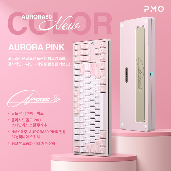 AURORA80 라인업에 신규 컬러 모델 ‘AURORA80 핑크’가 추가되었다. 감성적인 핑크 컬러와 고급스러운 골드 하이라이트 조합이 특징이며, 전용 스위치와 키캡, 보강판까지 핑크 컬러를 중심으로 특별히 설계된 모델이다.