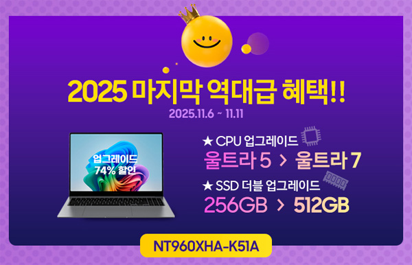 유니씨앤씨는최신 인텔 코어 울트라 루나레이크 프로세서와 WQXGA+ Dynamic AMOLED 2X 터치스크린을 탑재한 삼성 갤럭시북5 프로 NT960XHA-K51A 대상으로 최대 55만원 할인과 최대 24개월 무이자 할부 혜택,CPU & SSD 업그레이드 특가 혜택 등의 푸짐한 혜택이 증정되는 ‘빅스마일데이’ 프로모션을 2025년 11월 6일부터 11월 11일까지 G마켓를 통하여 진행한다.