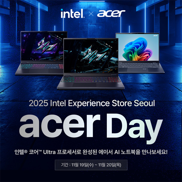 에이서가 오는 11월 19일부터 20일까지 서울 강남 OPUS 407에서 진행하는 ‘인텔 익스피리언스 스토어 서울(Intel Experience Store Seoul) 에이서 데이’를 통해 인텔® 코어™ Ultra 프로세서를 탑재한 최신 AI 기반 노트북 라인업 체험존을 운영한다.