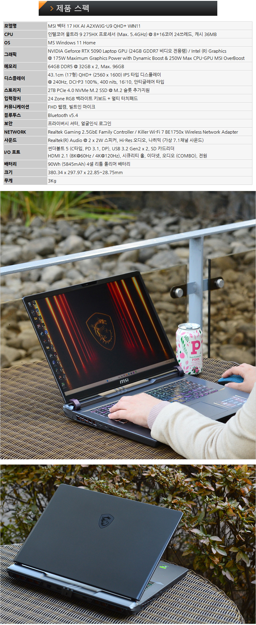 이번에 리뷰를 진행 할 MSI 벡터 17 HX AI A2XWJG-U9 QHD+ WIN11 은 퍼포먼스에 특화된 프리미엄 게이밍 노트북으로 인텔 코어 울트라 9 프로세서 275HX와 지포스 RTX 5090, 64GB DDR5 메모리 탑재로 일반 게이밍 노트북을 압도하는 성능을 경험할 수 있다. 특히 이 제품은 최대 250W MSI 오버부스트 기술이 적용되어 있으며 외장그래픽 만으로 작동할 수 있도록 MUX 스위치도 지원해 노트북의 최대 성능을 끌어낼 수 있다.