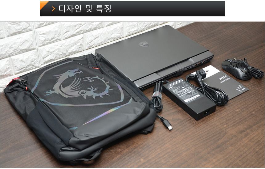 액세서리의 모습으로 330W 전원 어댑터와 전원 케이블, 퀵 매뉴얼, 보증서가 포함되어 있고 게이밍 마우스와 전용 백팩을 지원하는 것을 확인할 수 있다.