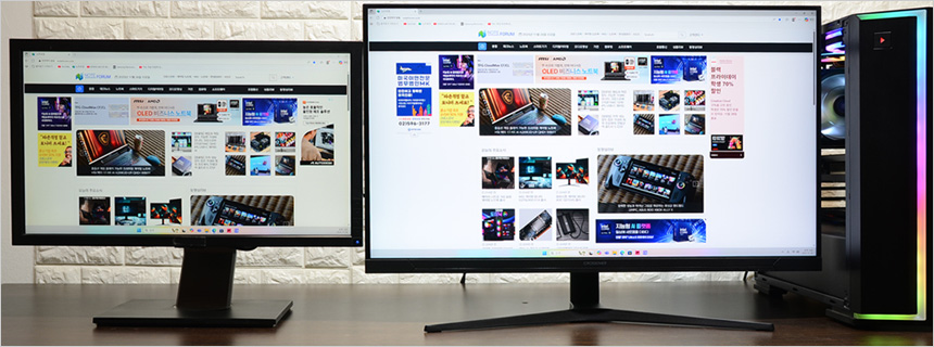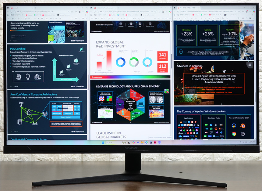 4K 해상도 지원으로 넓은 작업영역을 제공한다. 사진과 같이 3개의 웹페이지를 띄어두고 작업할 수 있어 게임이나 동영상 감상은 물론, 멀티테스킹 용도로도 손색이 없다. 참고로 문자가독성을 높이는 크로마서브 샘플링 4:4:4 모드 지원으로 편하게 글을 읽을 수 있었다.