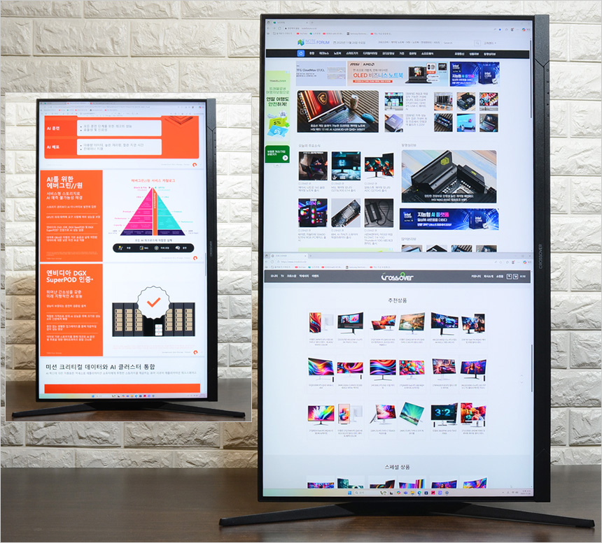 멀티스탠드는 틸트 뿐만 아니라 스위블과 높낮이 조절이 가능해 사용자에 맞게 각도를 조절할 수 있다. 또한 피벗을 지원하지 않는 일부 32형 모니터와 달리 피벗설정도 가능해 세로모드로 대화면 모니터를 활용할 수 있다.