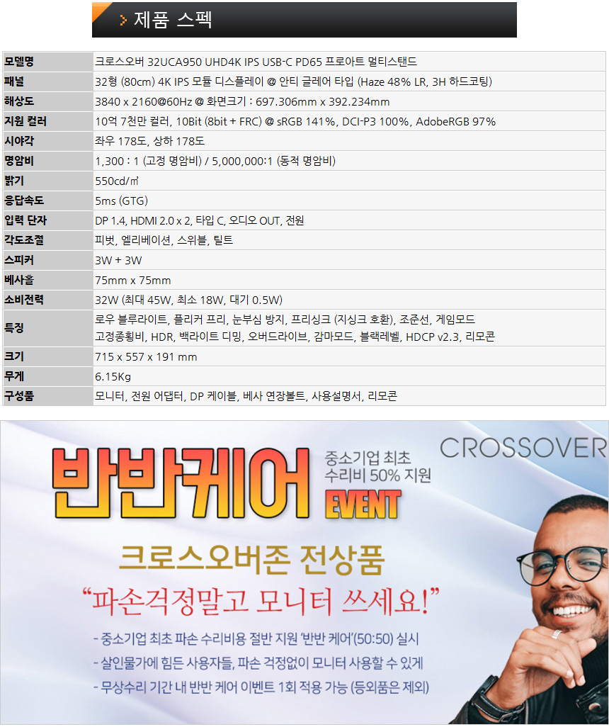 전문가를 위한 풀옵션 4K 모니터, 크로스오버 32UCA950 UHD4K IPS USB-C PD65 프로아트 멀티스탠드