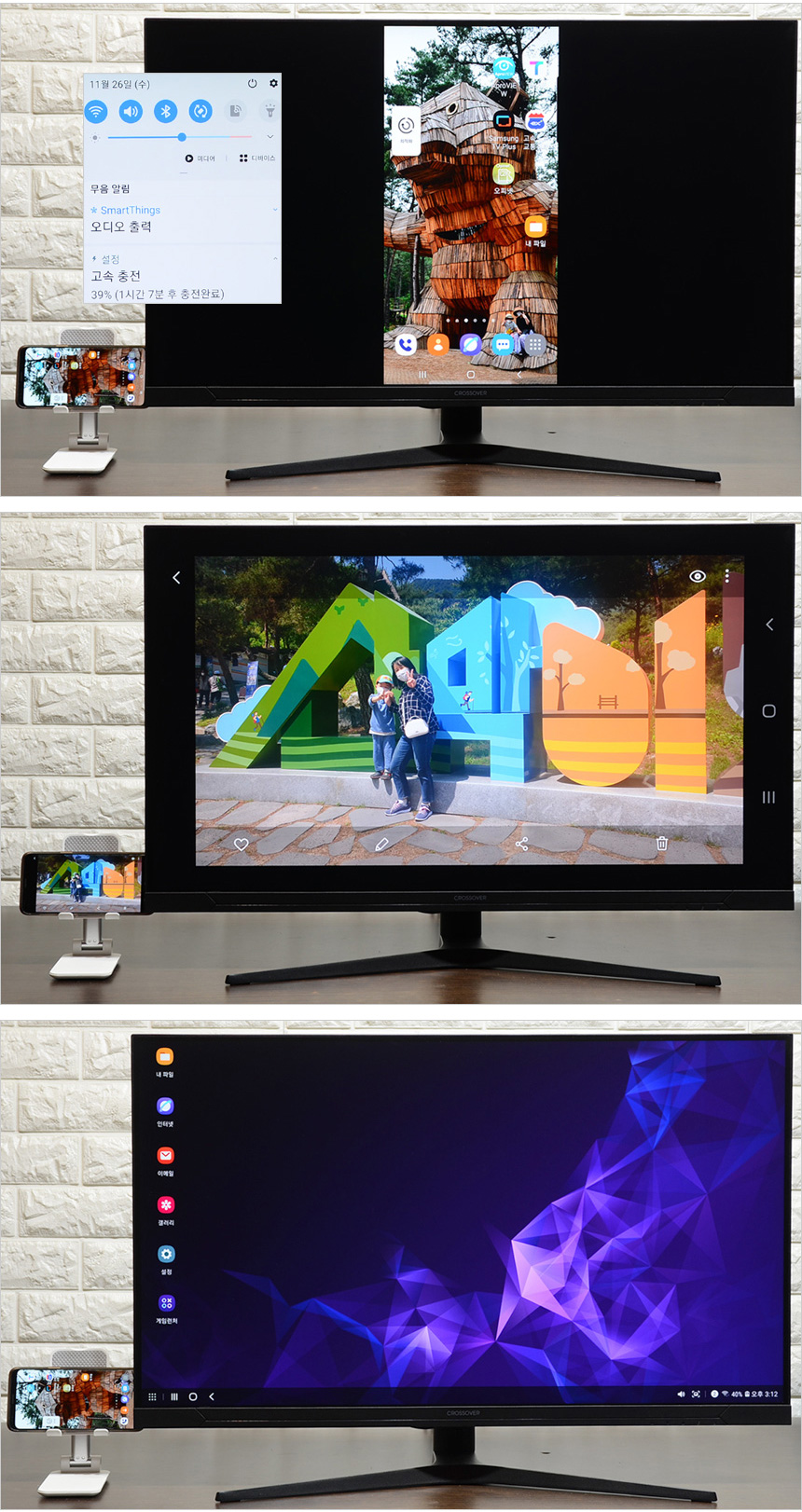 C타입 단자를 지원해 스마트폰 영상을 대화면으로 즐길 수 있다. 삼성 DEX를 지원하는 스마트폰을 사용하고 있을 경우 스마트폰 연결만으로 PC처럼 활용할 수 있으며 (키보드와 마우스는 스마트폰에 블루투스로 연결하면 된다.) PD충전을 지원하는 모뎁답게 연결즉시 스마트폰이 충전되는 것도 확인할 수 있었다. @ 참고로 충전은 모든 스마트폰에서 가능하지만 화면 출력은 미러링을 지원하는 스마트폰에서만 가능하다.