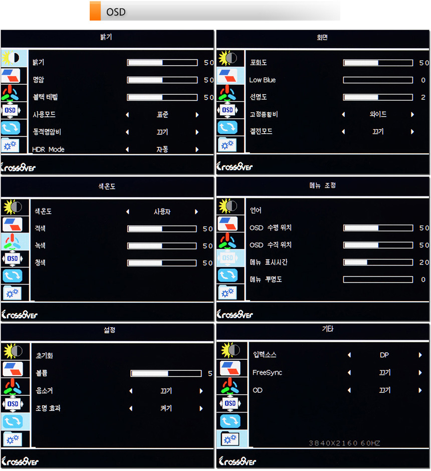 OSD에서 모니터를 사용자에 맞게 설정할 수 있다. 특히 리모콘을 제공해 입력소스, 화면비율, 조준선, 볼륨, 화면모드, 블루라이트, 등을 빠르게 설정할 수 있다.