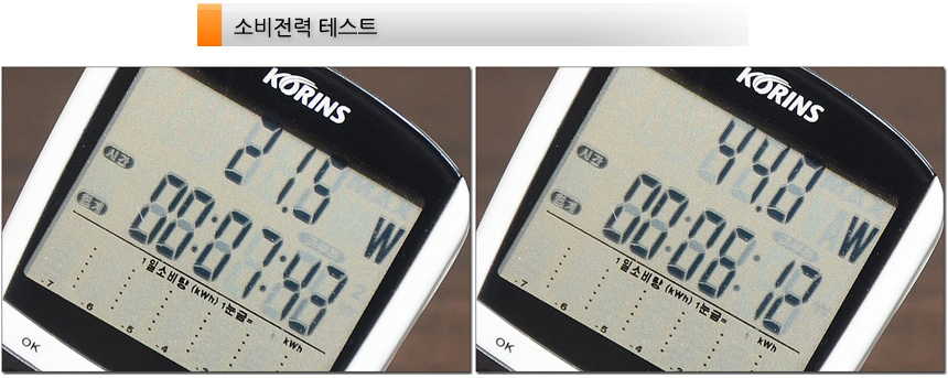 소비전력 테스트를 진행하고 있는 모습으로 100% 밝기에서는 44W 소비전력을 보여주었으며 50% 밝기에서는 21.5W로 소비전력이 낮아지는 것을 확인할 수 있었다. (화면크기와 해상도 대비 소비전력이 낮은 것이 무척 마음에 든다. 참고로 50% 밝기로만 설정해도 사용에 전혀 불편이 없는 모델이다.)